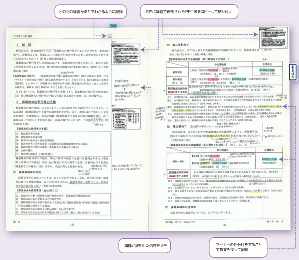 また、余白を多くとってくれているため、講義で説明された重要なポイントのメモや講義使用されたレジュメなどを貼り付けられます。